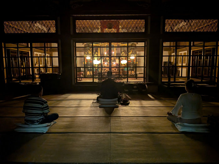 現在慈眼院では茶道教室を月に2~3回程度で行っています。また簡単にお茶の世界を楽しんで頂こうと、随時希望の日に茶道体験ができます。朝の勤行は毎朝 7時~8 時に行っており、どなたでも本堂にお入りいただくことができます。また月に一度、夜の座禅会も致しております。その他にも、いつでも写経ができるようにしております。気が向いた時、時間ができた時にいつでも書くことができます。
