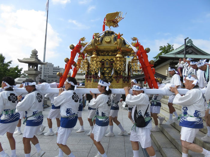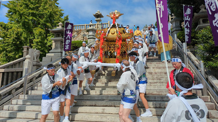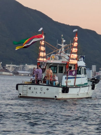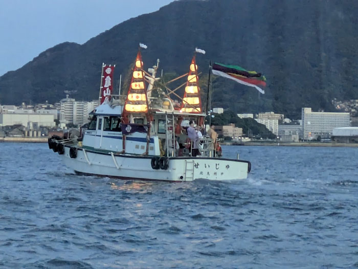 その際には提灯で飾られた船にお神輿を乗せ関門海峡を一巡する海上渡御も行われます。これは「関の提灯まつり」とも呼ばれ、かつては提灯で飾り付けられたたくさんの船が、お神輿船にお供し海峡を巡っていたそうです。その光景が不夜城を彷彿とさせるようなイメージでとても幻想的だったそうです。そのお供の船の中で、乗船者は旬のタコに舌鼓をうちながら楽しんでいたようで、今でもお神輿船、お供の船の乗船者にはタコが振舞われています。