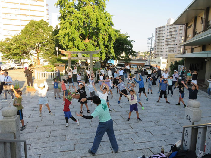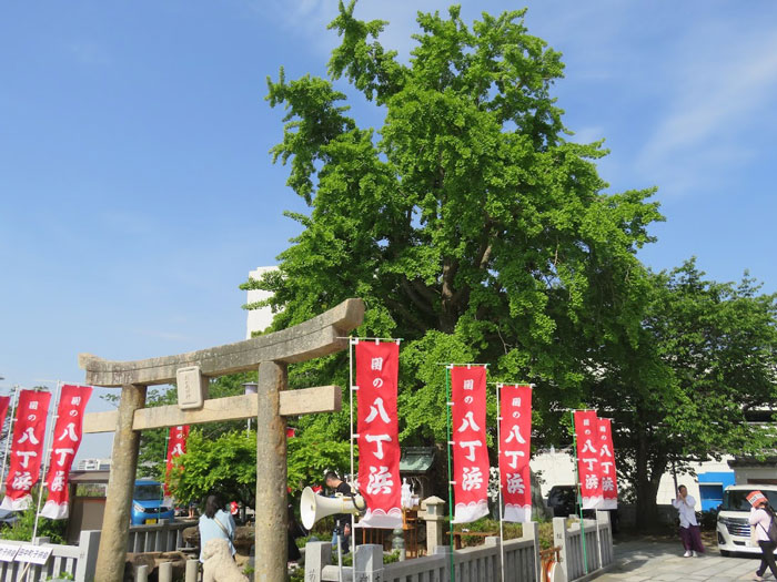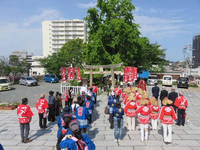 この神社がある場所はかつて島で、江戸時代始め頃、この地の発展の為に良い港を造る工事で、陸続きになりました。その埋め立てられた広大な土地を「八丁浜」と呼んでいます。その時に、人柱として街の発展に貢献した「お亀さん」という女性を讃えるお祭が「八丁浜総踊り」です。