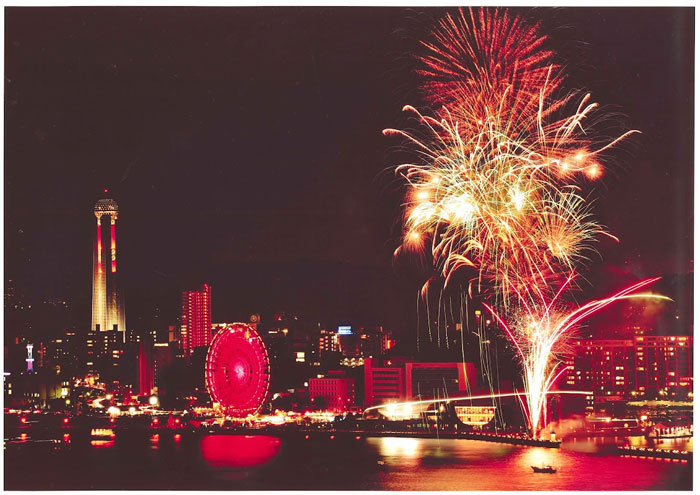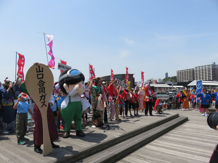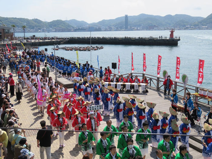 お祭りの際には「八丁浜エラヤッチャ」と掛け声をあげ、お囃子に合わせて杓子を叩きながら踊ります。この「エラヤッチャ」は「お亀さんは偉い奴だ」という意味です。江戸時代、この地を治めていた毛利藩は派手な歌舞音曲や酒宴などを禁止していましたが、八丁浜が行われる期間中はその禁止令が解かれ、町のいたる所に「賑わい勝手」の札が立てられ、騒いでも良い期間となりました。戦後に一時衰退した行事ですが昭和60年に市民祭として復活し、現在は「しものせき海峡まつり」に合わせて開催され、継承されている行事です。