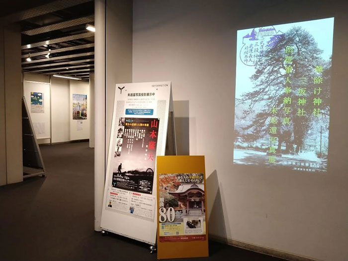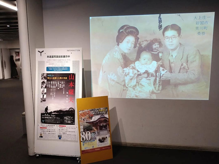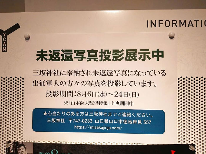 また、山口市には、「山口情報芸術センター(YCAM:ワイカム)」という、県内最大の芸術センターがあり、映像系アートの拠点になっています。「写真」をキーワードにした三坂神社とYCAMの「終戦80年コラボ企画」として、YCAMの映画館フロアを会場に、出征軍人の写真をデジタル化して展示する「デジタル写真展」を開催しました。