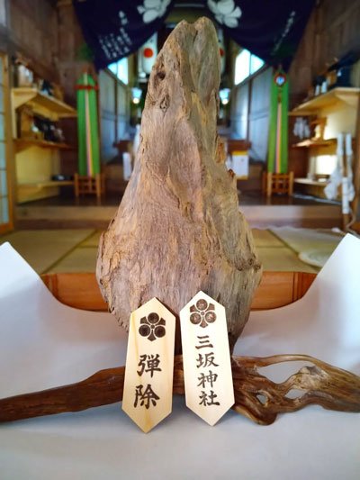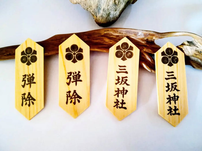 昔から出している「弾除け御守り」は、財布やスマホケースに入れて頂ける「弾除け身代わり木札」として、今も出しています。木札には地元の檜を使用して、地元の木工職人の方に1体ずつ手作りしていただいています。これは災難除けの身代わり木札で、もしこれが割れたら身代わりになってくれたということで、新しいものと交換していただきます。この「弾除け身代わり木札」と「桜の枝御守り」は、とても人気で、多くの方におわかちしております。「弾除け」とは災難除け、厄除け、危機回避・危険回避という意味ですので、災難除けを望む方や、危険を回避したいご職業の方などは今でも当社に「弾除け祈願」を受けに来られます。例えば、自衛隊の方ですとか。弾除け祈願の際には、祈願を受けるご本人様の顔写真を納めて頂きます。