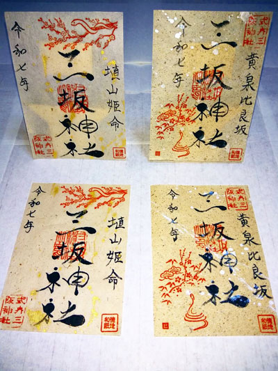御朱印もさまざまな種類を出しており、書置きの御朱印は現在8種類ほどがあります。全て徳地和紙を使用しており、金箔や銀箔をまぶした風の和紙や、写真まつり限定のカラフルな御朱印もあります。他に、黄金の切り絵の御朱印など、さまざまな種類をご用意しております。