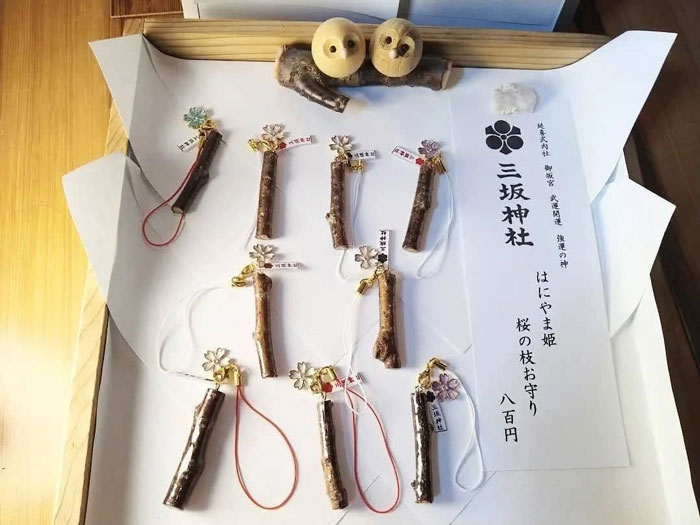 御守りはこの神社独自のものがたくさんあります。御守りは、御守りを作ってくれる業者さんに発注すると、御守り袋の裏に神社名を入れて、納品してくれます。そういった御守りが一般的ですので、御守り袋の見た目は多くの神社で似通っている場合があります。ですが当社では、三坂神社の完全オリジナルの御守りを色々と奉製しています。たとえば、私自身が全て手作りしている御守り(みたま守り)や、地元の桜の環境保全団体とコラボして、地元の桜の枝を使った手作りの「桜の枝御守り」もあります。