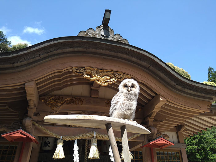 フクロウの親鳥が、数年おきに、赤ちゃんを神社の社殿の中に置いていくのです。赤ちゃんは、社殿の屋根裏の梁に住み着きます。そこに赤ちゃんを置いていく理由は、恐らく外敵が来ないからだと思いますが、夜は社殿を閉めているにも関わらず、朝社殿を開けると赤ちゃんがいるので、どこから入っているのかとても不思議ではあります。