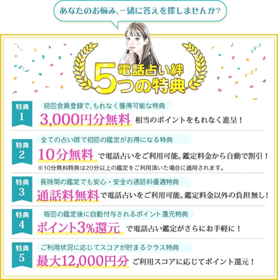 | 特典内容 | 初指名10分無料 (対象の占い師5名まで) | 初指名10分無料 (対象の占い師3名まで) | 5,000円以上購入で ポイント2倍 | 1,000円+初指名 10分無料 | 3回目までポイント付与 (合計4,500円分) | 初指名10分無料 (対象の占い師7名まで) | 3回目までポイント付与 (合計6,000円分) | 3回分のポイント付与 (合計4,500円) | 3回までポイント付与 (1,000円分×3) | 3回目までポイント付与 (合計3,000円) | 初指名10分無料 | 新規登録で 3,000円分無料クーポン | 会員登録で 3,000円分のポイント | 初回登録で 3,000円分のポイント 提供:ティファレト | 初回登録で 3,000円分のポイント 提供:ティファレト | 初回pt購入で 1,000円分プレゼント | 初回10分間無料鑑定 (最大2,450円分) | 初指名10分無料 (2名まで) | 初指名10分無料 (対象の占い師何名でもOK) | 初回当日限定50% 割引クーポン | 初回3,000円分無料鑑定 (最大14分間) | 初指名5分無料 | 占い師全員対象 5分間無料鑑定 | 初回10分間の無料鑑定 提供:LINEヤフー | 最大10分間 無料鑑定 | 初指名10分無料 (占い師3名まで) | 初回5,500円分無料鑑定 | 初指名5分無料 (全員対象) | 初回登録で1,200円分 LINE登録で1,500円分 |